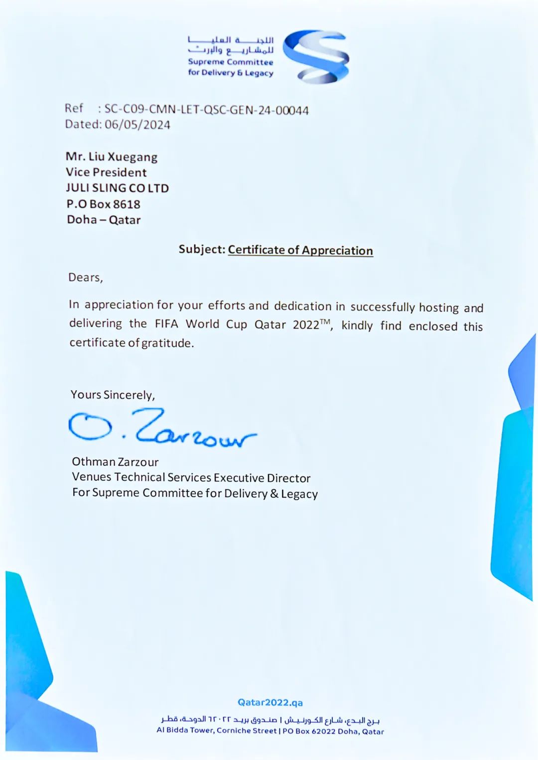跟着2024年暖和的春意,咱们收到了来自名目业主——卡塔尔托付和遗产最高委员会(SUPREME COMMITTEE FOR DELIVERY & LEGACY)的感谢感动信及承认证书,这是对咱们过往尽力的最好必定。信中的每个字句,都是对咱们团队辛苦任务和不懈尽力的高度承认。这份光荣不只属于咱们,也属于每位撑持和存眷咱们名目的人。您们的信赖和撑持是咱们最可贵的财产,是咱们不时进步的能源源泉。
