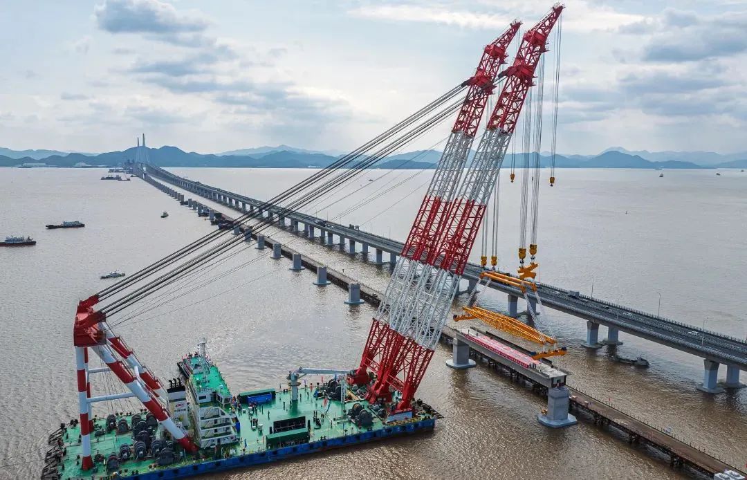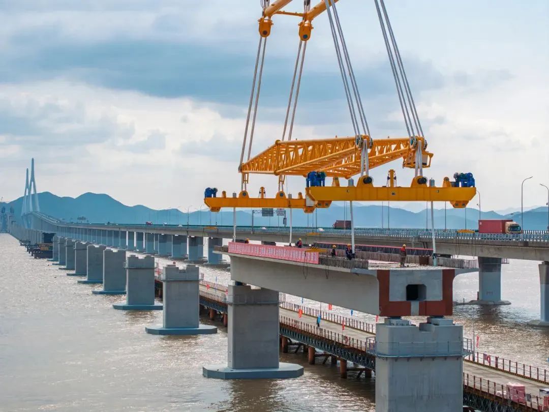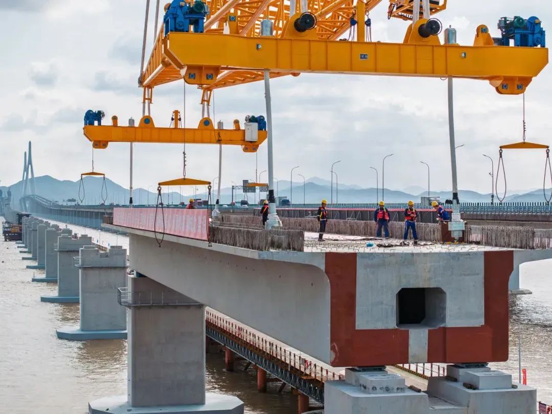 大桥海上架设预制箱梁共66榀,每榀梁长60米,宽10.6米,重约1700吨,吊具重280吨,整体起吊总重1980吨,是国际市域(郊)铁路工程跨度最大、吨位最重的预应力混凝土预制箱梁。