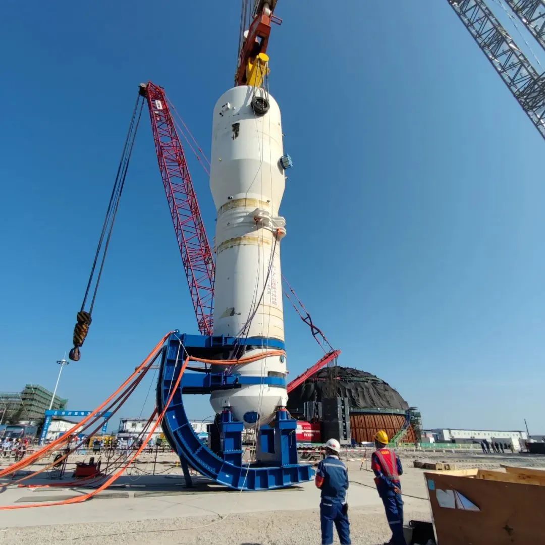 ZH-65型蒸汽产生器是华龙一号机组最焦点的装备之一,它的体积庞大,布局庞杂而邃密,自接到吊装使命,巨力索具名目团队起首清楚情势和使命,同一大局认识和办事认识,明白各阶段吊装方针和标的目的,吊装计划接纳新型翻转装配,该装配操纵重力和杠杆道理,无需特别牢固办法就可以使主装备和翻转支架构成一个全体,对照传统的牢固支架装置调剂和装置、装配抱环等工序,操纵轻易、宁静性高,人因失误几率低,极大晋升了施工效力和宁静。