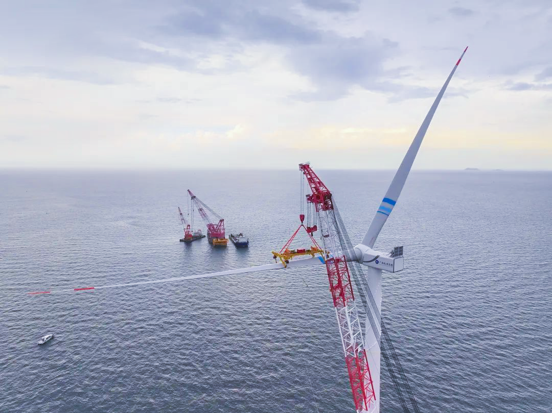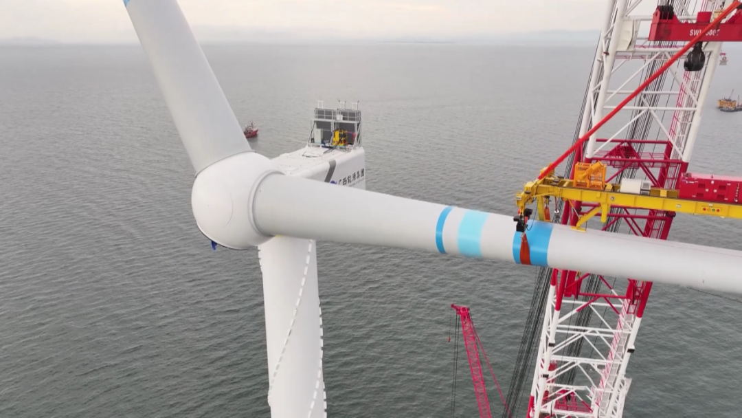 据悉,本次吊装的风机电组单支叶片长111.5米、重42吨,叶轮扫风面积40627平方米。